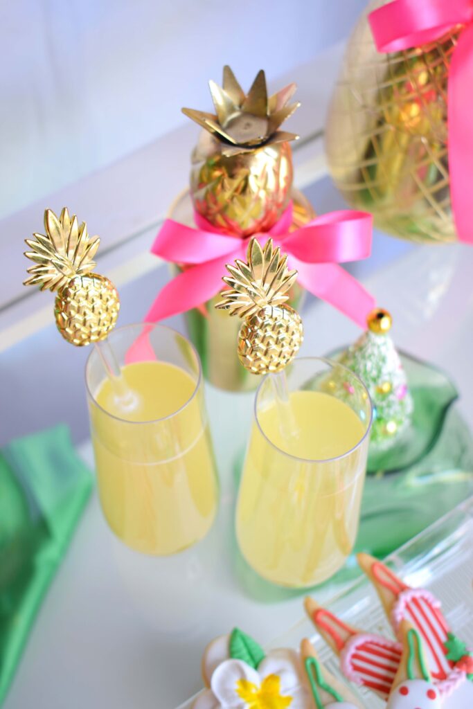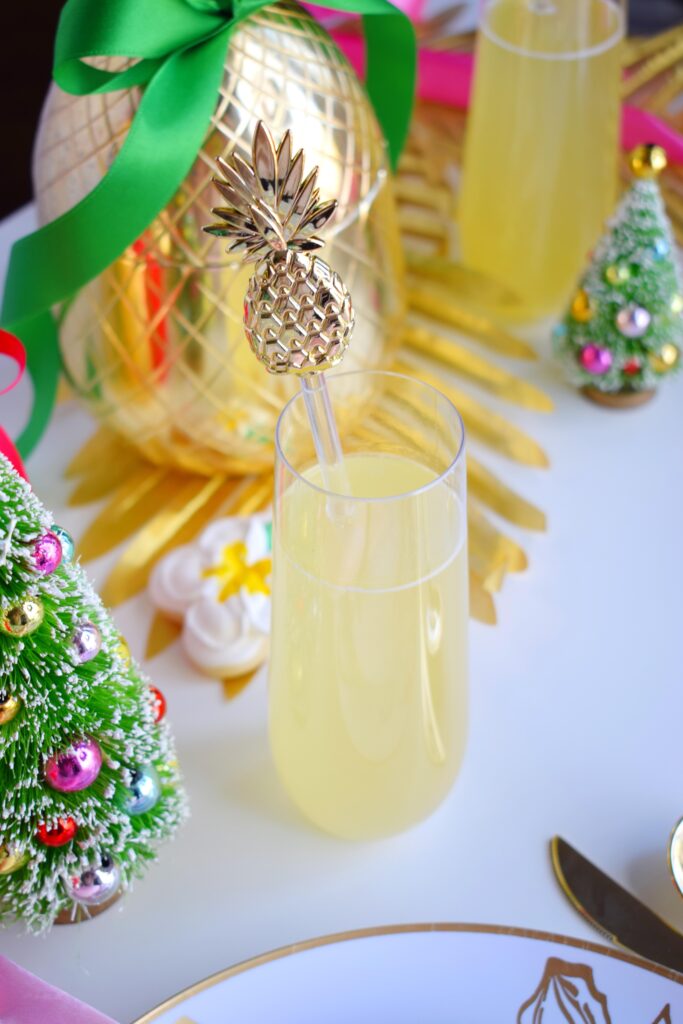 I love serving a cocktail that coordinates with my table décor and theme. For this setup I served pineapple mimosas that taste (and look) like Hawaii in a glass! Better yet, when using these gorgeous clear flutes, the color of the drink shines through perfectly! I love the pop of yellow they add to the décor.