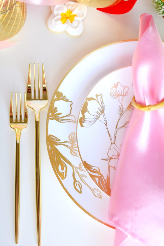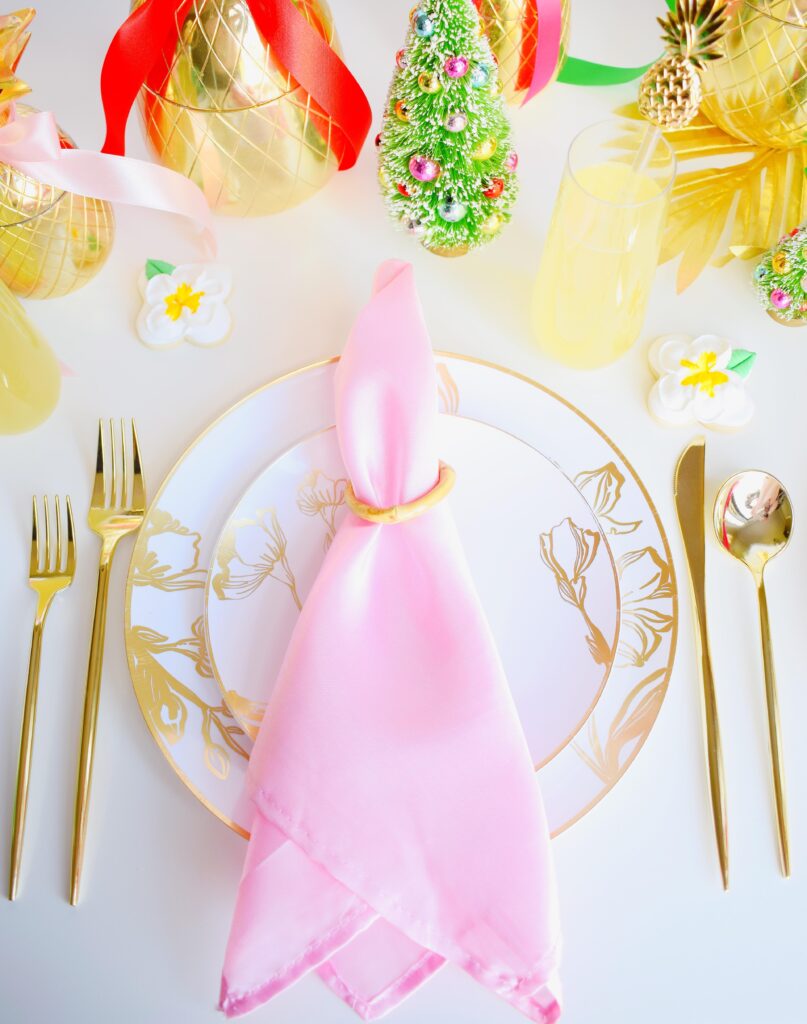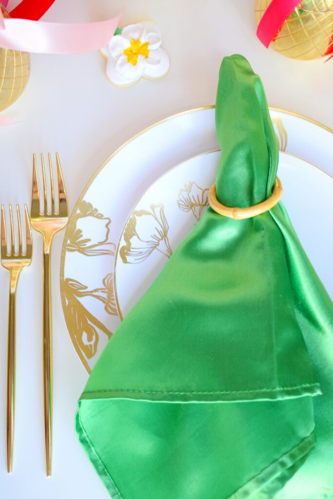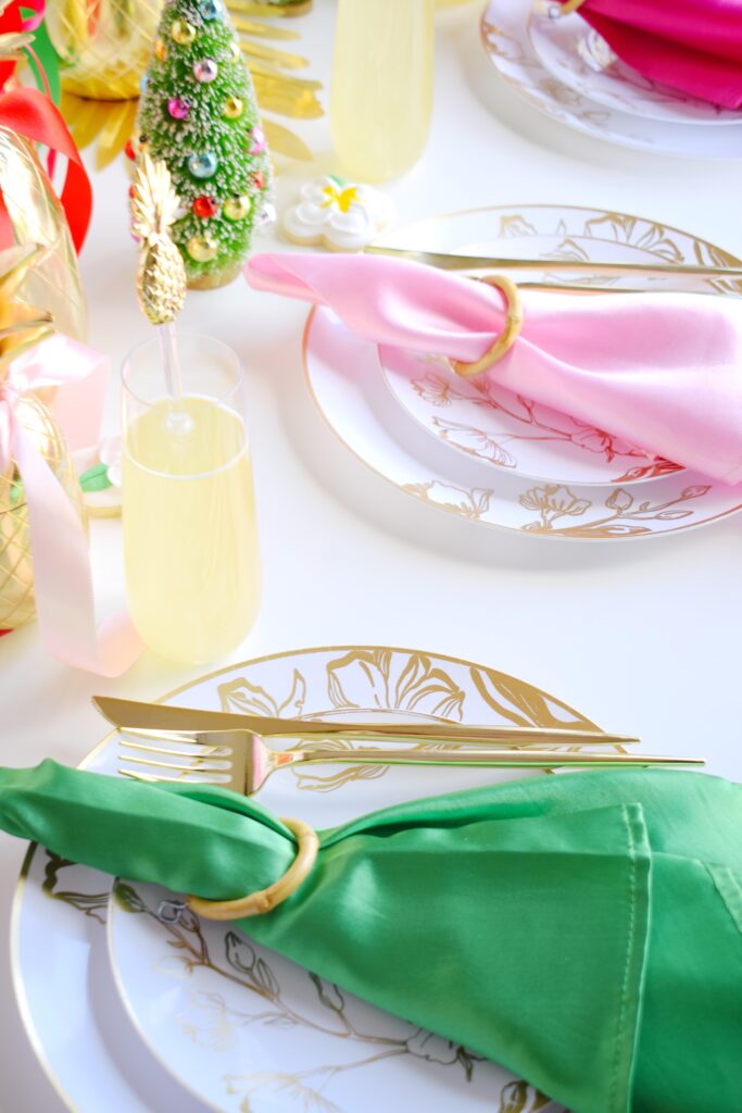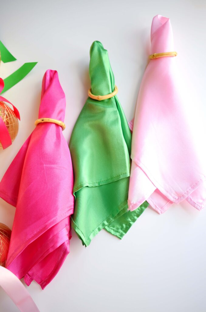 Mixing and matching tableware is always a great way to add dimension to a table. Mixing up linens has the same effect. I used a few different shades of pink, red, and green napkins but all in the same gorgeous satin fabric. The result is a bright, cheery, and festive table that feels even more personal and custom. Efavormart has the best color selection of anywhere I’ve found for simple linens.