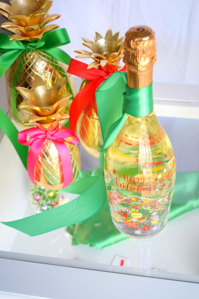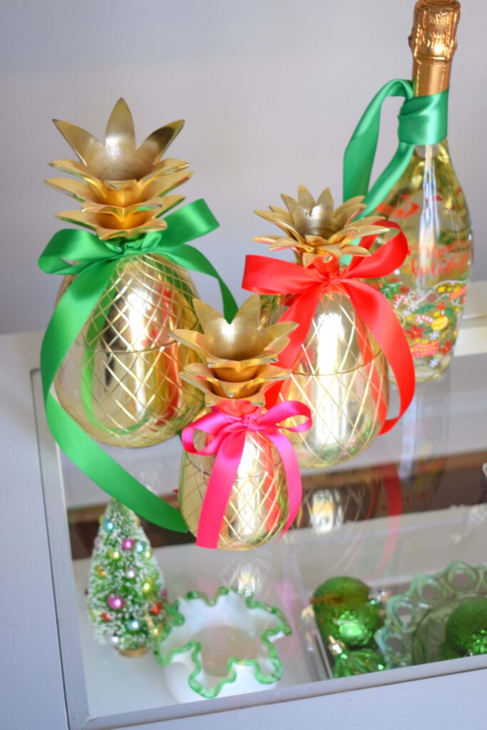 My gold pineapples are one of my favorite collections. I’ve found them all over but most came from Home Goods. I move them from room to room in our home but always have them displayed. Dressed up with some simple satin ribbon from Michael’s they’re transformed into the most perfect holiday décor. I love the bows so much I just may keep them on indefinitely!