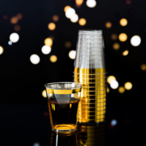 When serving fine beverages at an event, these gold-rimmed dainty plastic shot cups lend a touch of sophistication to the drinking experience. Your guests will appreciate the great presentation along with their choice of scotch, bourbon or whiskey.