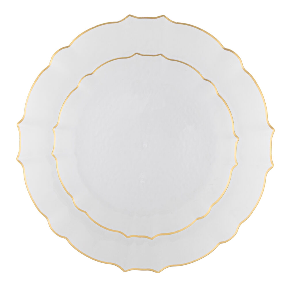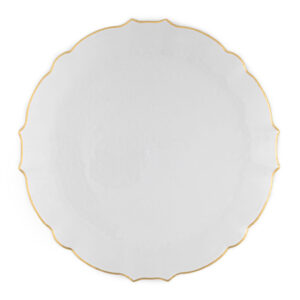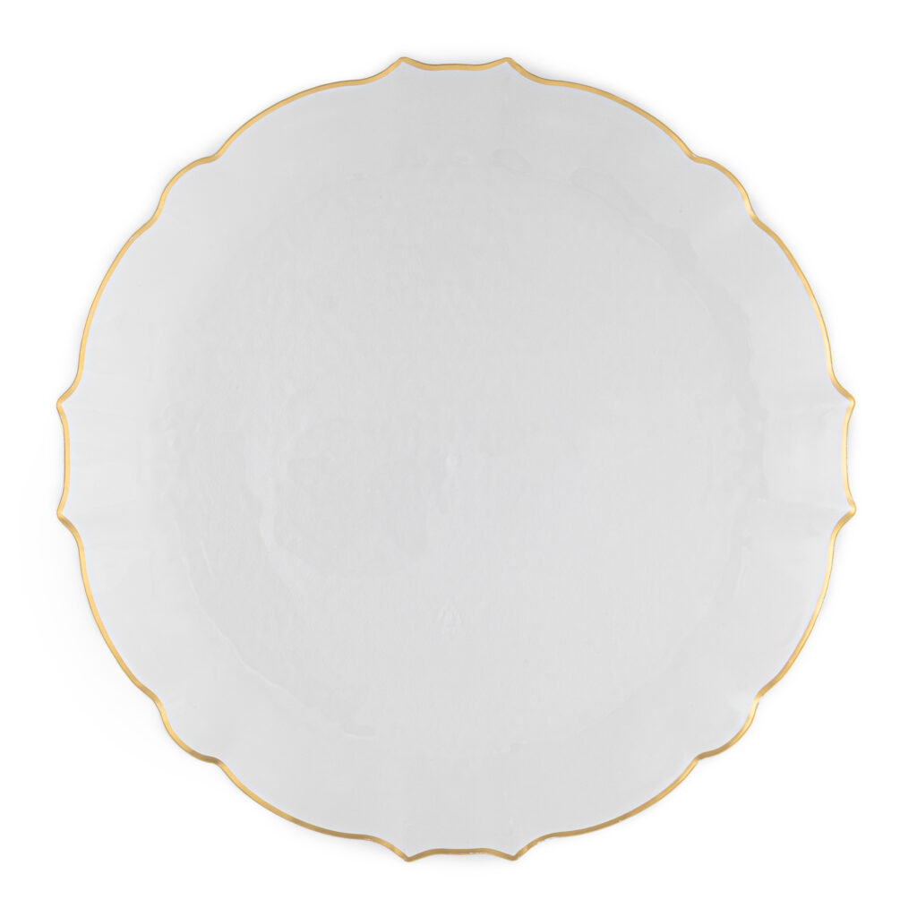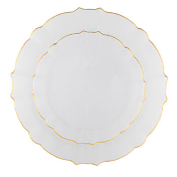 An elegant statement piece with a soft pearled finish and a delicate gold-trimmed scalloped edge—this aristocratic plate brings refined charm and timeless luxury to any table.