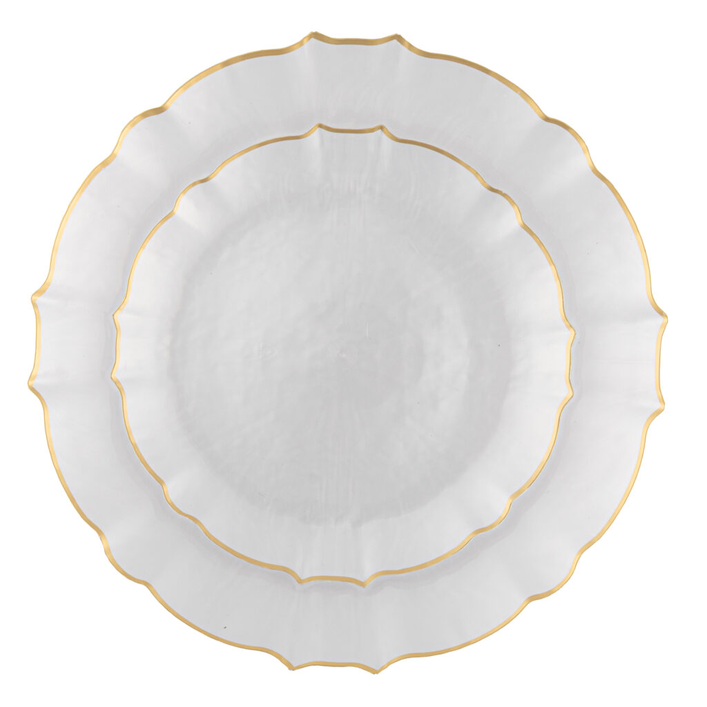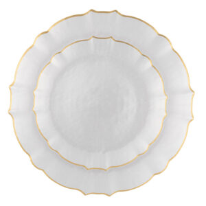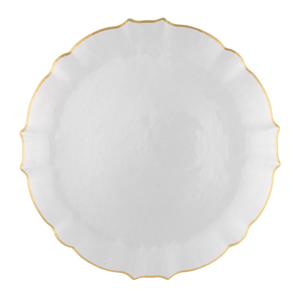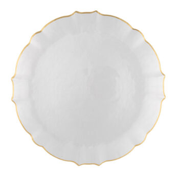 An elegant statement piece with a soft pearled finish and a delicate gold-trimmed scalloped edge—this aristocratic plate brings refined charm and timeless luxury to any table.