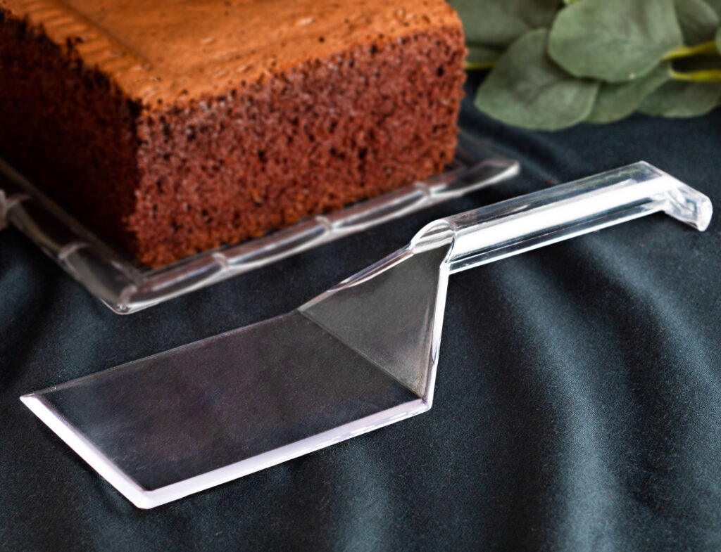 Caterers love these great quality clear plastic spatulas. They’re great for serving fish, steaks or cakes at weddings, receptions or elegant parties where real silverware is not a desirable option. And although they’re disposable, they hold up well and you can easily use them a number of times.