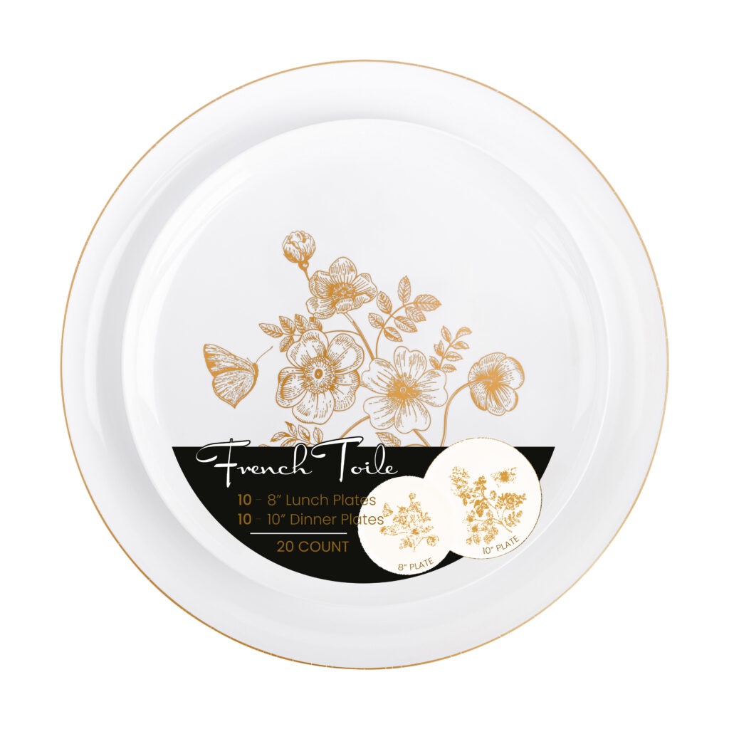 French Toile Combo Plates (8″ & 10″) Gold/White