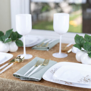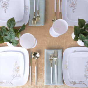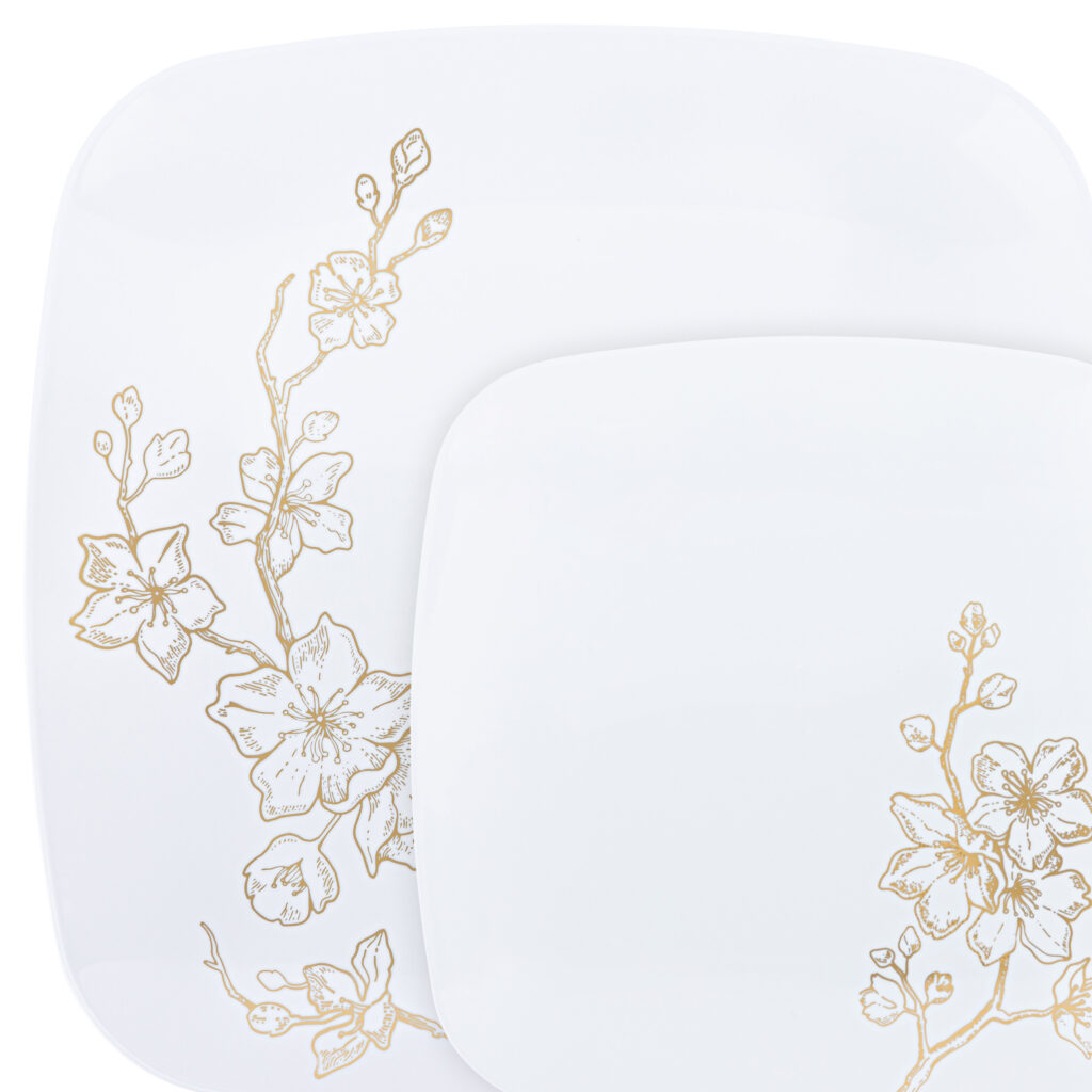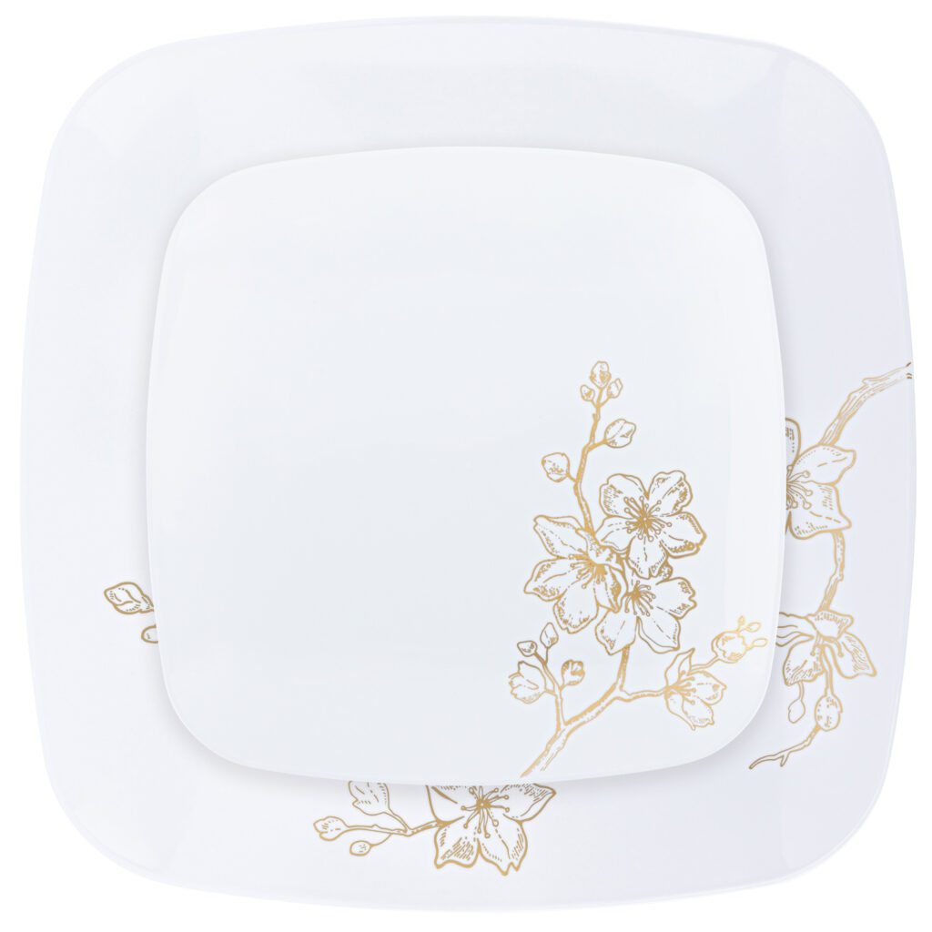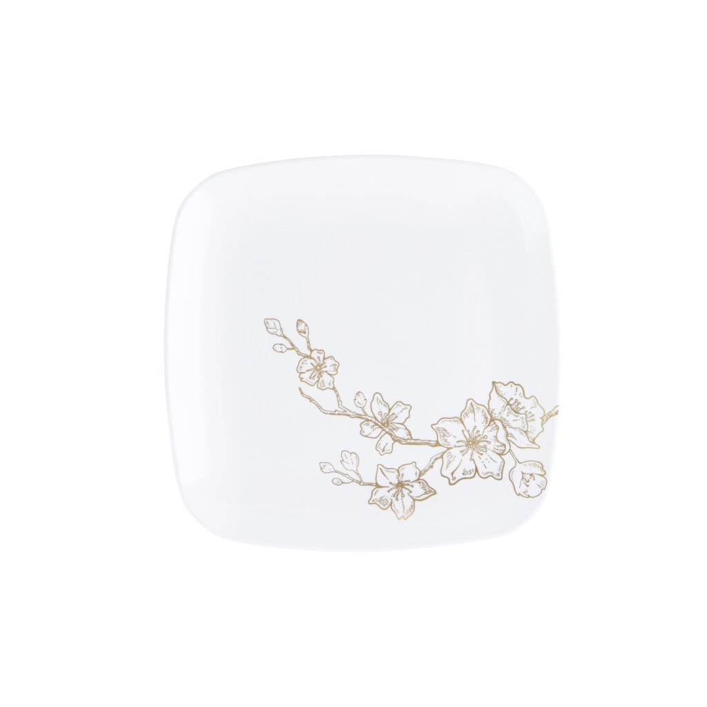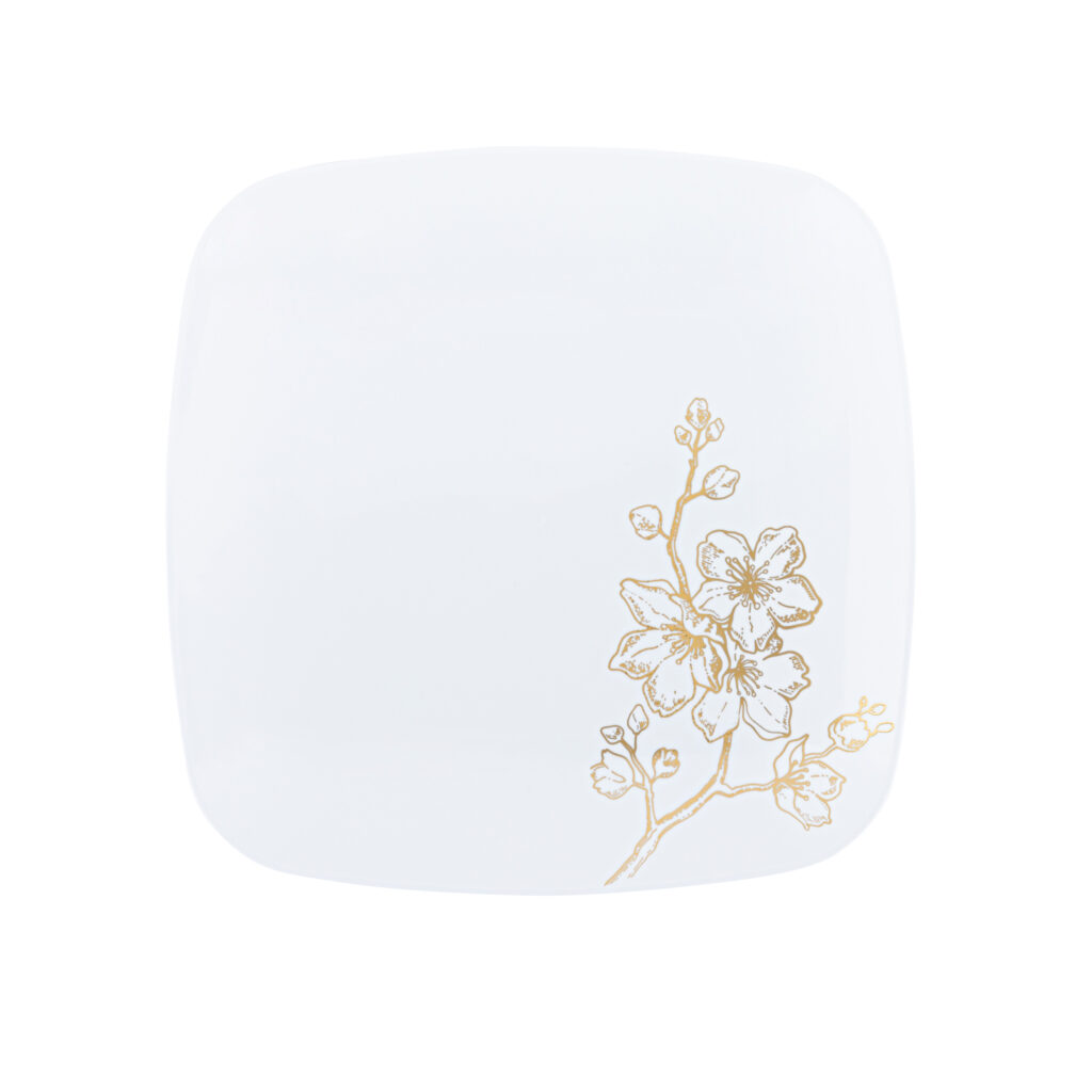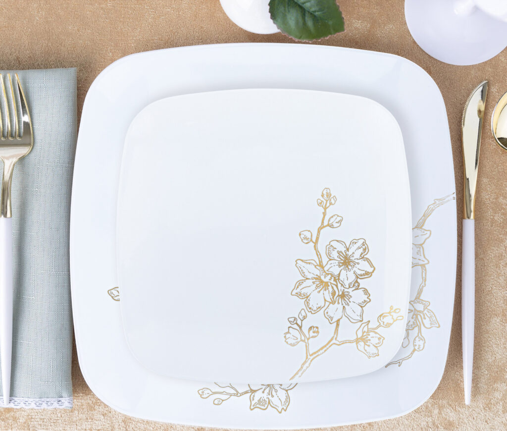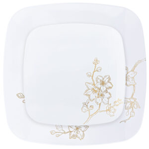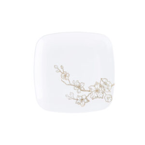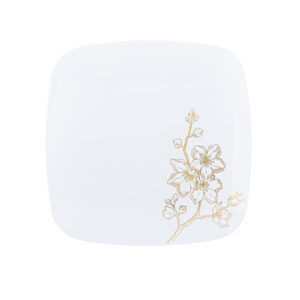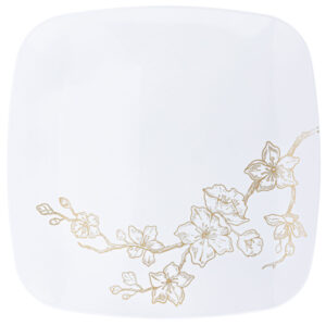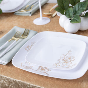 Gold Buds dinnerware is the ultimate square plastic plate collection for those who care about style. The high quality hard plastic with the floral design makes it a showstopper at weddings, parties and catered events.