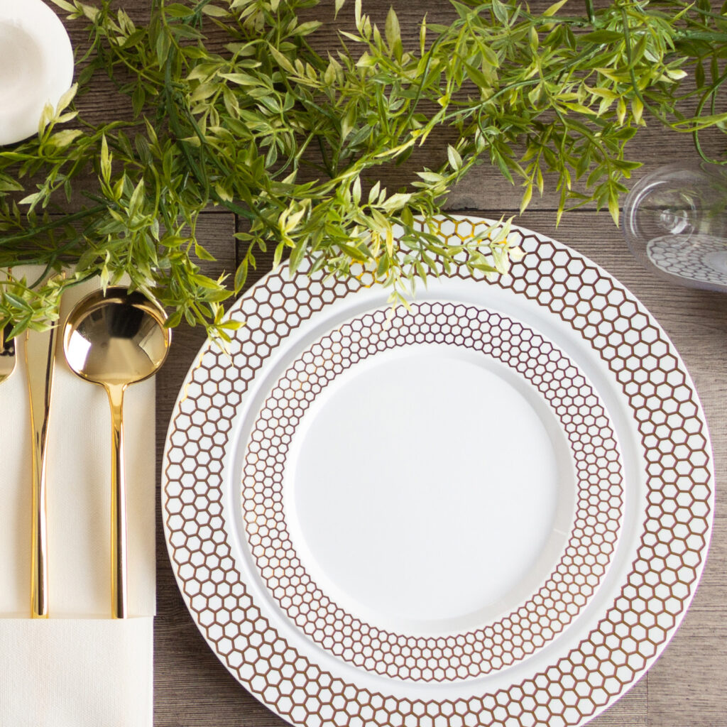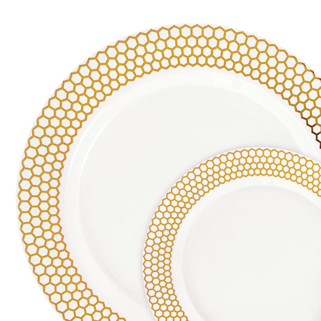 For an extraordinary event, ordinary dinnerware won’t do. The Honeycomb Collection is made of fine white hard plastic, with a sleek honeycomb border, setting your party apart from standard. You like being unique. These plates are as unique as you.