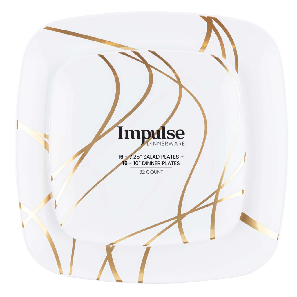 The sharp gold design adds a perfect modern touch to this classic square plate! Enhance your table with the impulse collection.