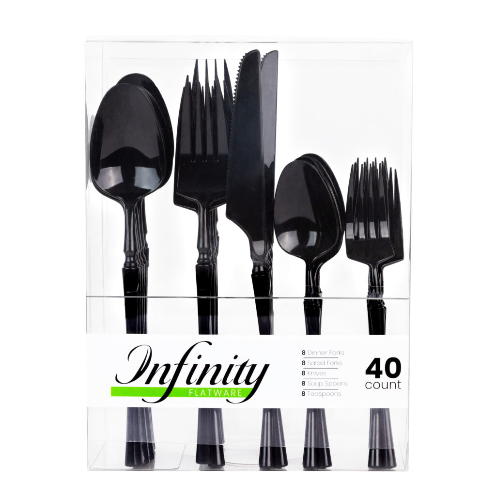 The all new infinity flatware is here to enhance your parties and formal events. Its sleek, elegant, and on trend design is sure to impress!