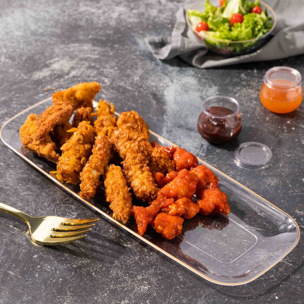 For those who appreciate simplicity and modern elegance, this 17.5″ rectangle organic tray is a must-have. Its versatility makes it perfect for serving deserts, fruits, or even as a centerpiece. Don’t forget to pair it with its compatible lid to complete the package and add an extra layer of protection for your food.