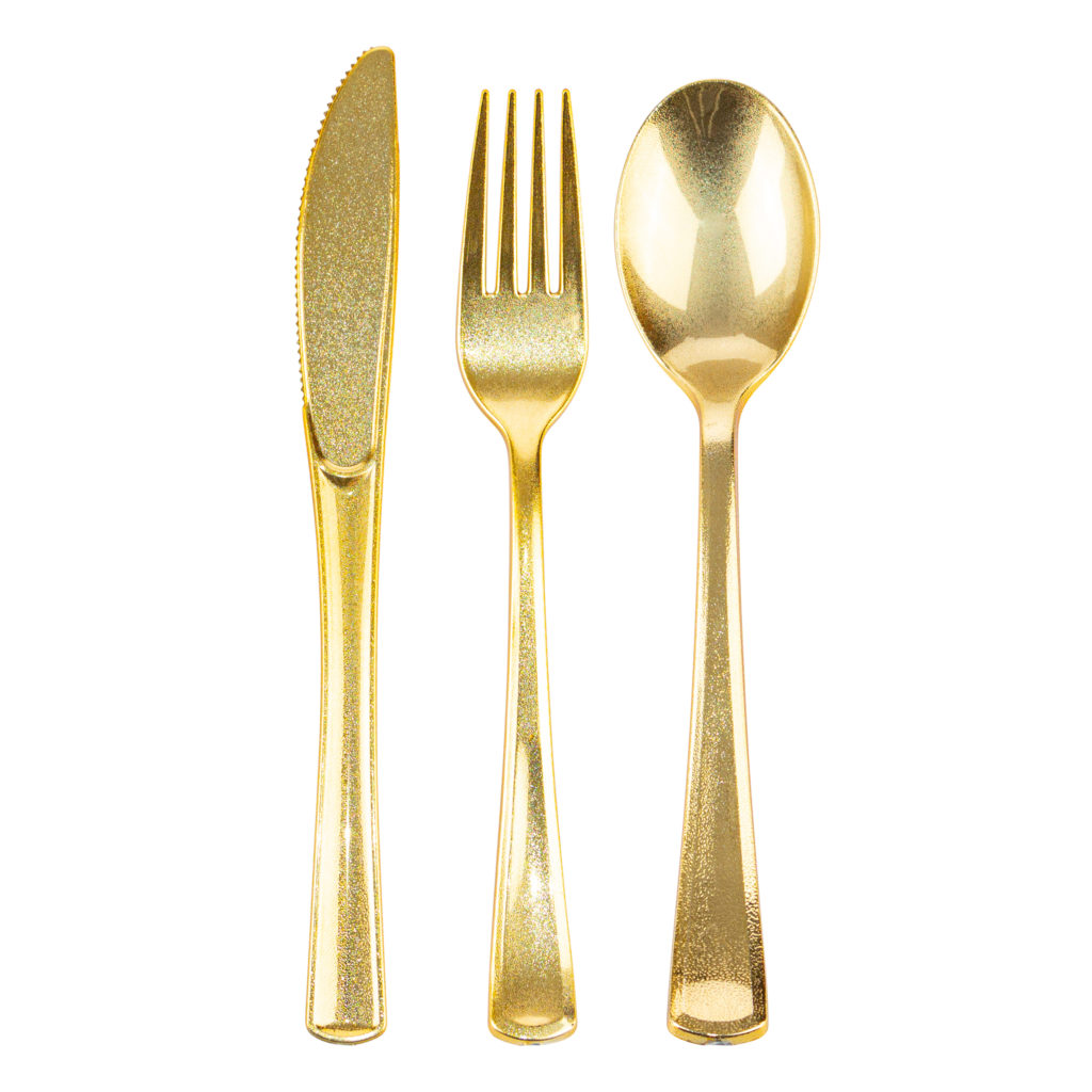 Add oomph to your table setting with an exciting sparkle in your flatware! This gold plastic flatware set will surely dazzle the guests at your party.