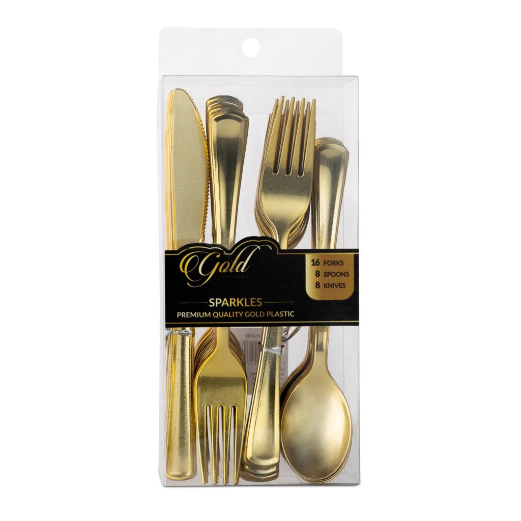 Add oomph to your table setting with an exciting sparkle in your flatware! This gold plastic flatware set will surely dazzle the guests at your party.