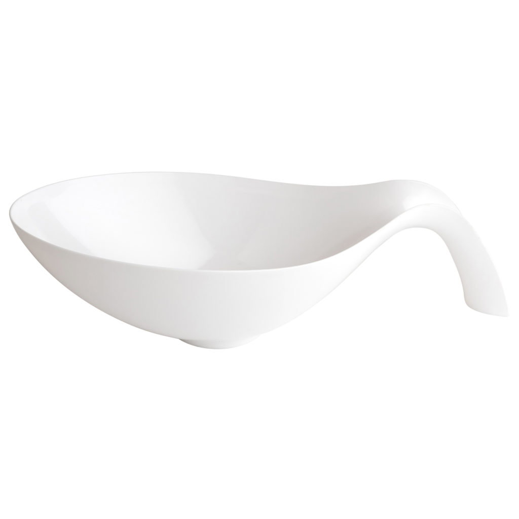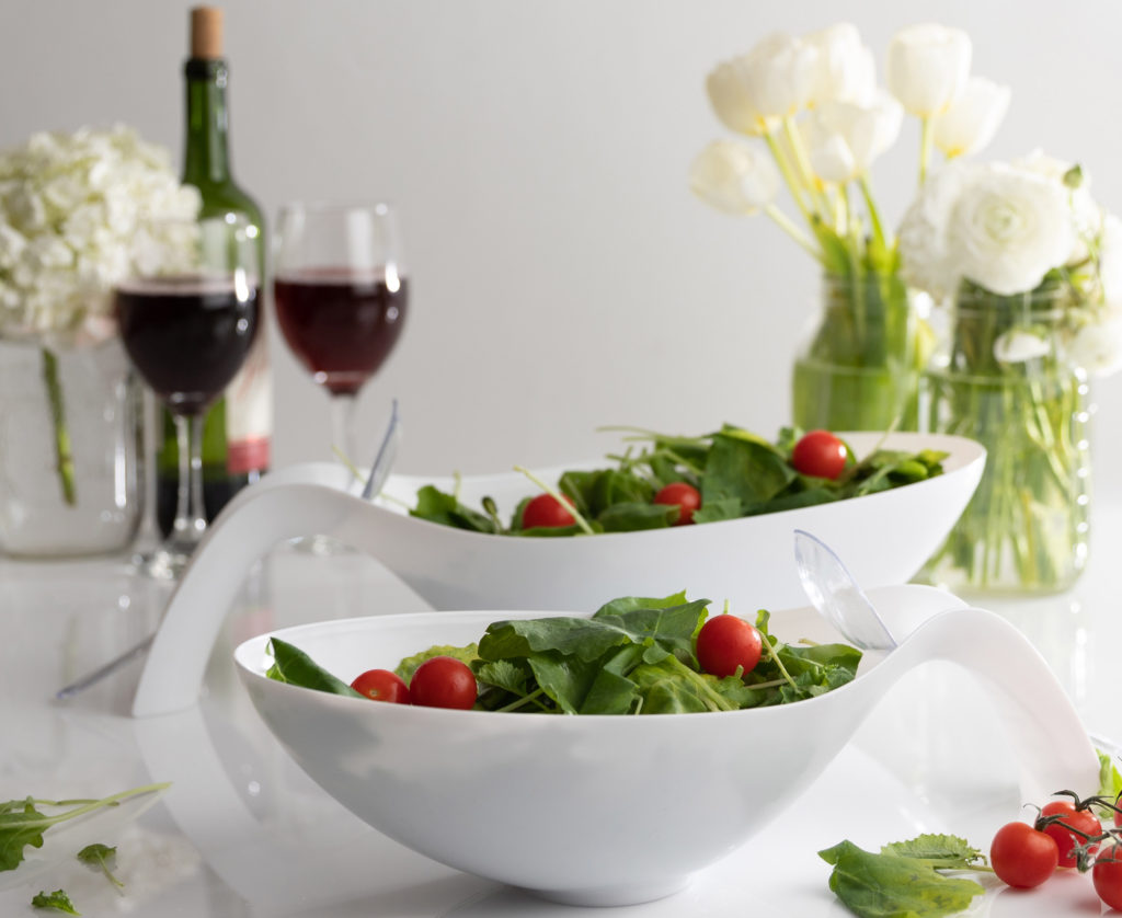 This cool looking, crowd friendly, easy to pass, salad bowl, has a spot for your serving pieces to keep them from falling into the food. Serve in style!