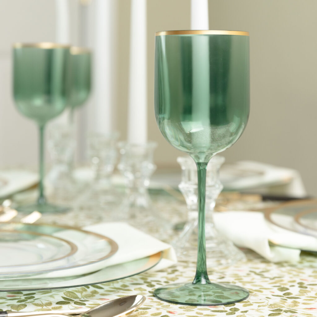 A sharp and elegant gold rim on a clean stemmed goblet will add the right touch to your table!